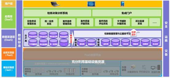 我项目组采用云计算、大数据的现代信息技术作为电子检务工程软件应用建设的总体架构。通过建设的数据共享交换系统和数据服务总线管理系统搭建数据服务层(DaaS层),对检察院所有业务数据进行数据整合,横向打通检察院所有业务科室之间的数据壁垒,将检察院业务数据标准化,和最高检的统一业务系统实现无缝对接,并按照权限提供数据服务,为大数据分析和应用提供了坚实的基础。