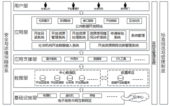 四、基础设施层:由政务外网(互联网区)、服务器、存储备份、安全防护、安全认证、系统软硬件、机房环境等内容组成,承担着为省(市)公共数据开放网站提供网络、计算、存储、备份、安全防护、认证、交换等服务的重要职责。