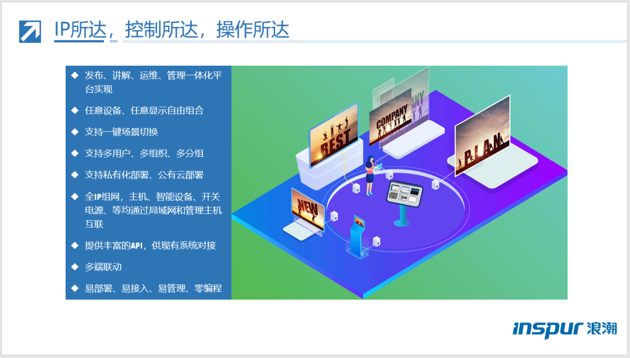 基于局域网络,将展厅所有显示终端(LCD、LED、拼接大屏)、声光电等智能设备接入网内,通过控制中台将显示内容、智能设备(声光电)融为一体,通过后台配置任意组合,打造一体化沉浸式展厅控制完整解决方案,建设灵活多样、实施简便、使用方便、实时互动、更新简单的智慧展厅。